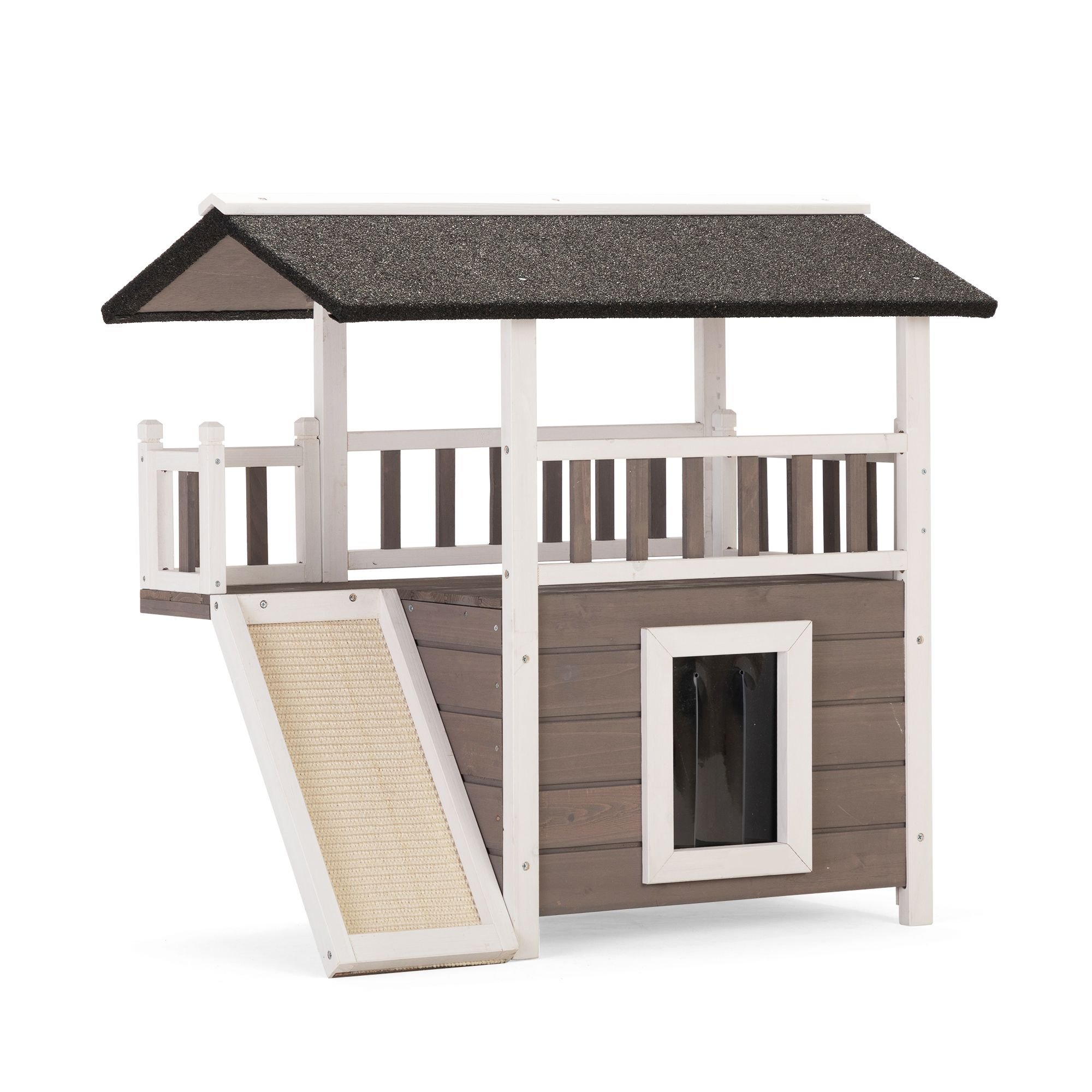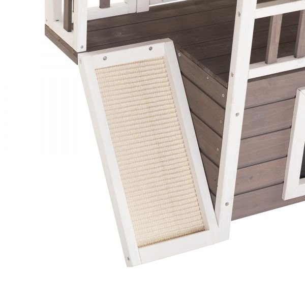 Home > 2-Tier Outdoor Wooden Dog House, Weatherproof Dog Hutch with A Large Balcony, Sisal Scratching Pad Ladder, Gift for Pets, Gray and White