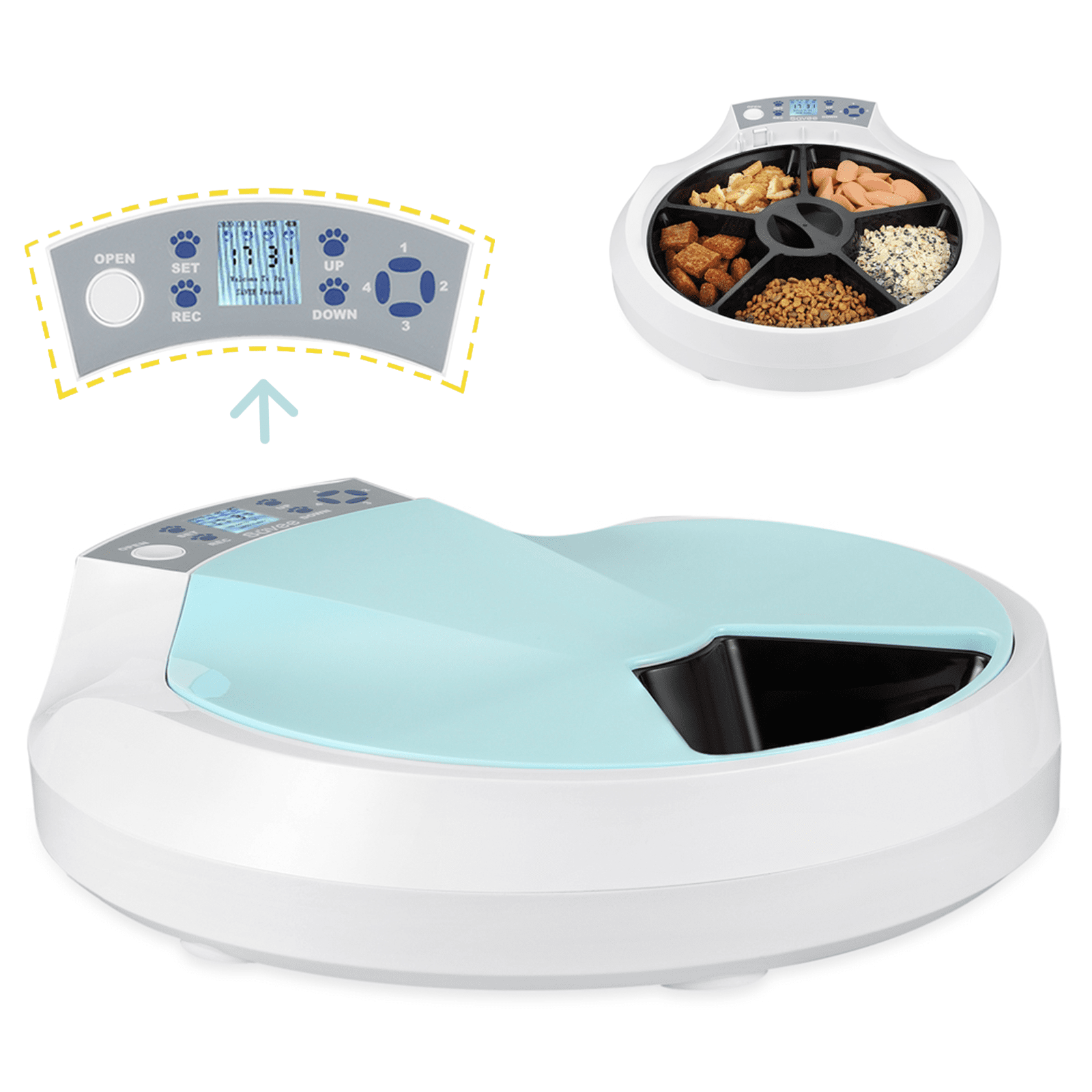 [5x270ml ISOLATED FOOD SECTIONS]The automatic pet food dispenser is made of ABS material, with five compartments, each with a capacity of 270 ml, which can store both dry food and wet food. It will serve up to 5 meals, one initial feed and four further timed feeds. Can make your pet feeding more convenient.