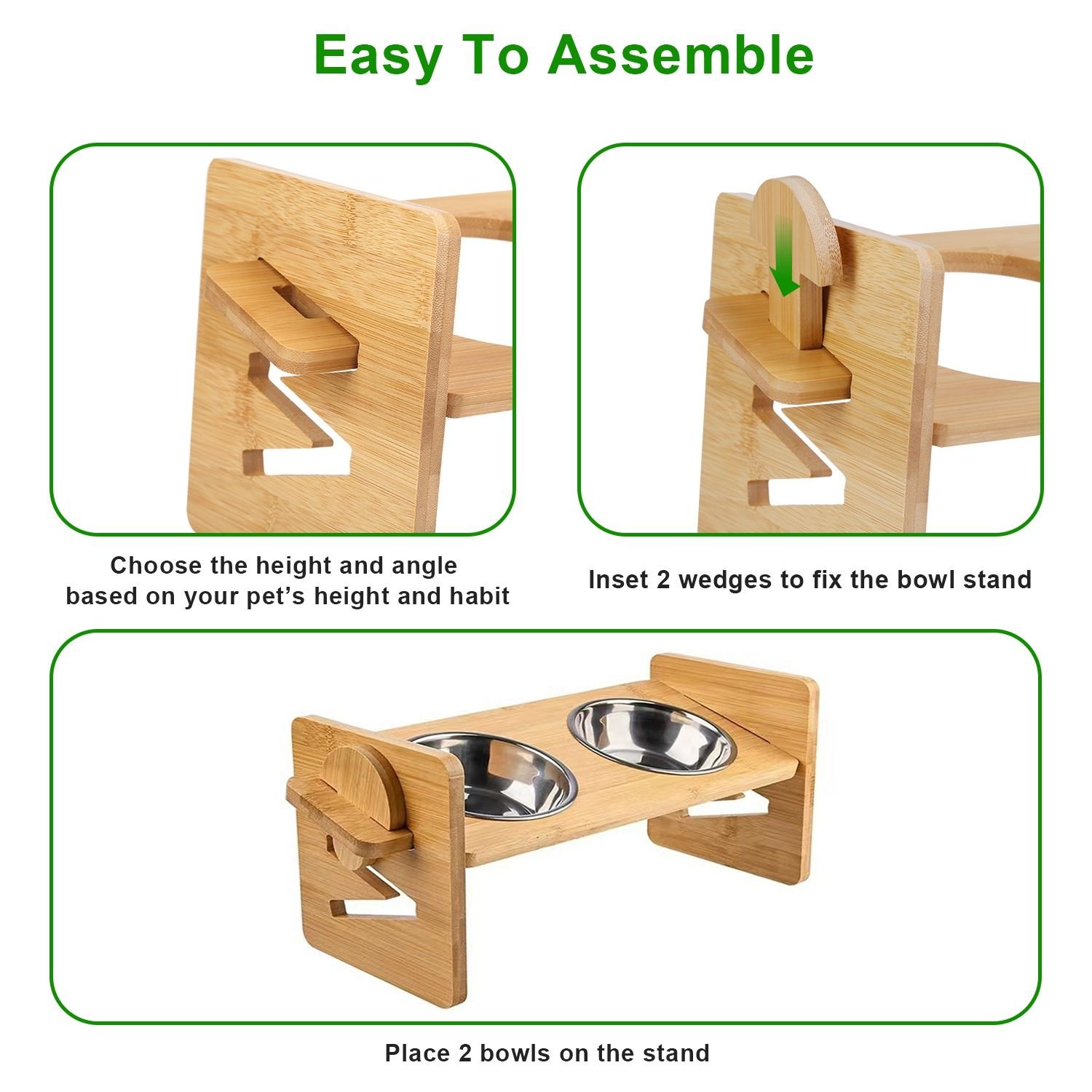 *Easy To Assemble & Store*:No tools needed,our pet feeder is assembled by 5 bamboo boards,which can be easily detached and placed under the feeding platform for easy storage.