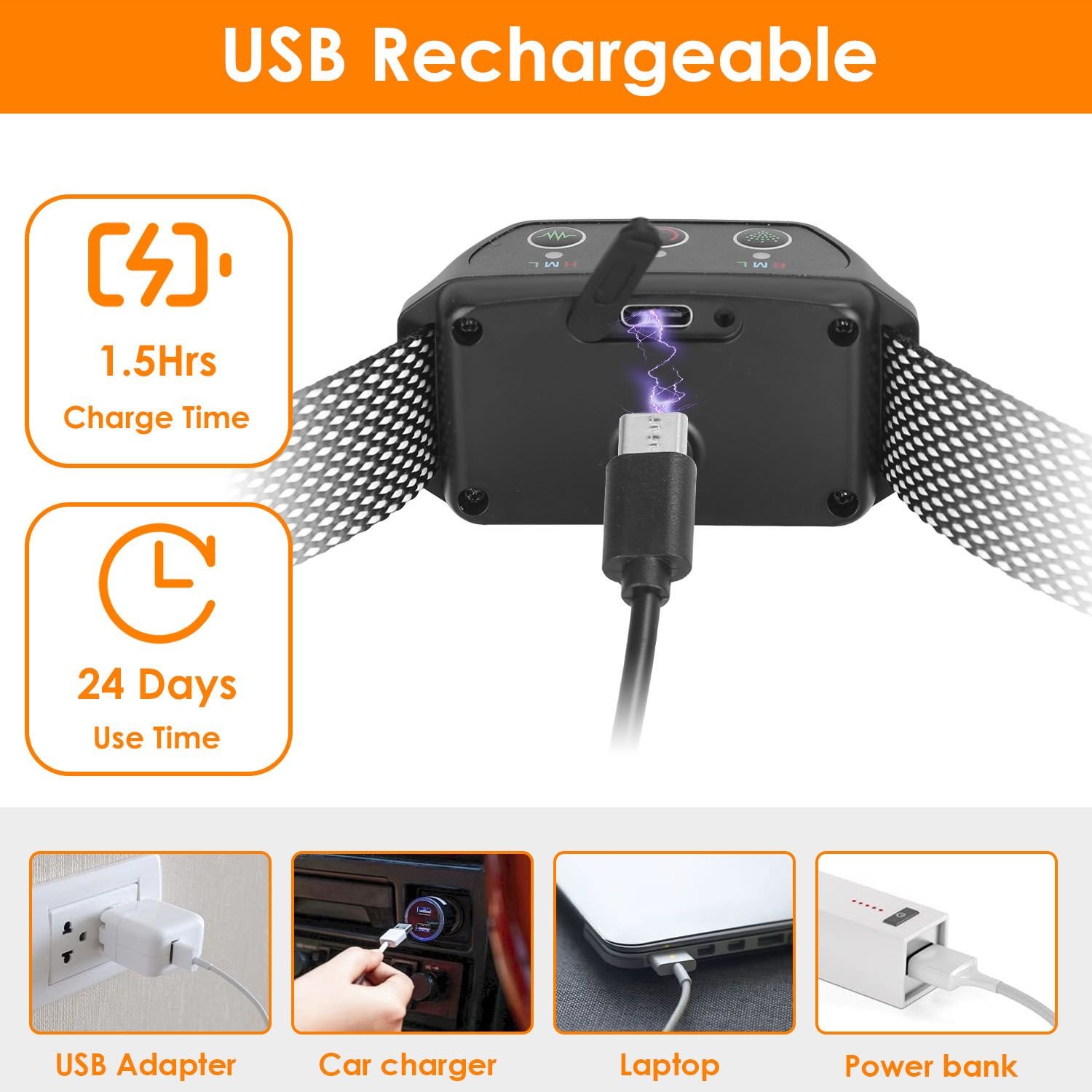 *USB Rechargeable & Long-lasting Dog Collar*: Featured with 120mAh rechargeable battery, the spray bark collar can keep standby for 24 days after 1.5 hour’s fast charging.