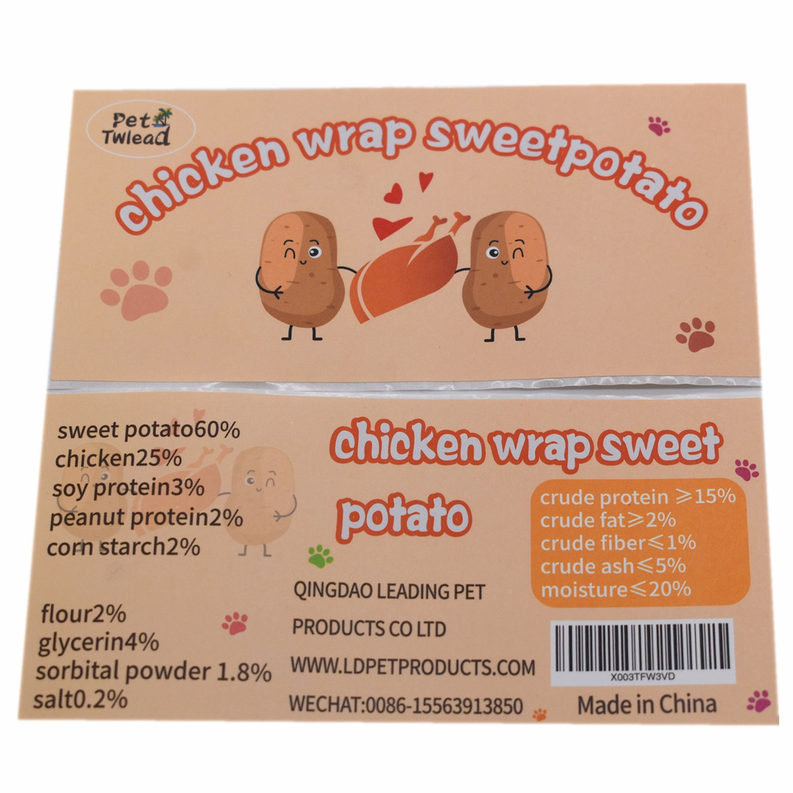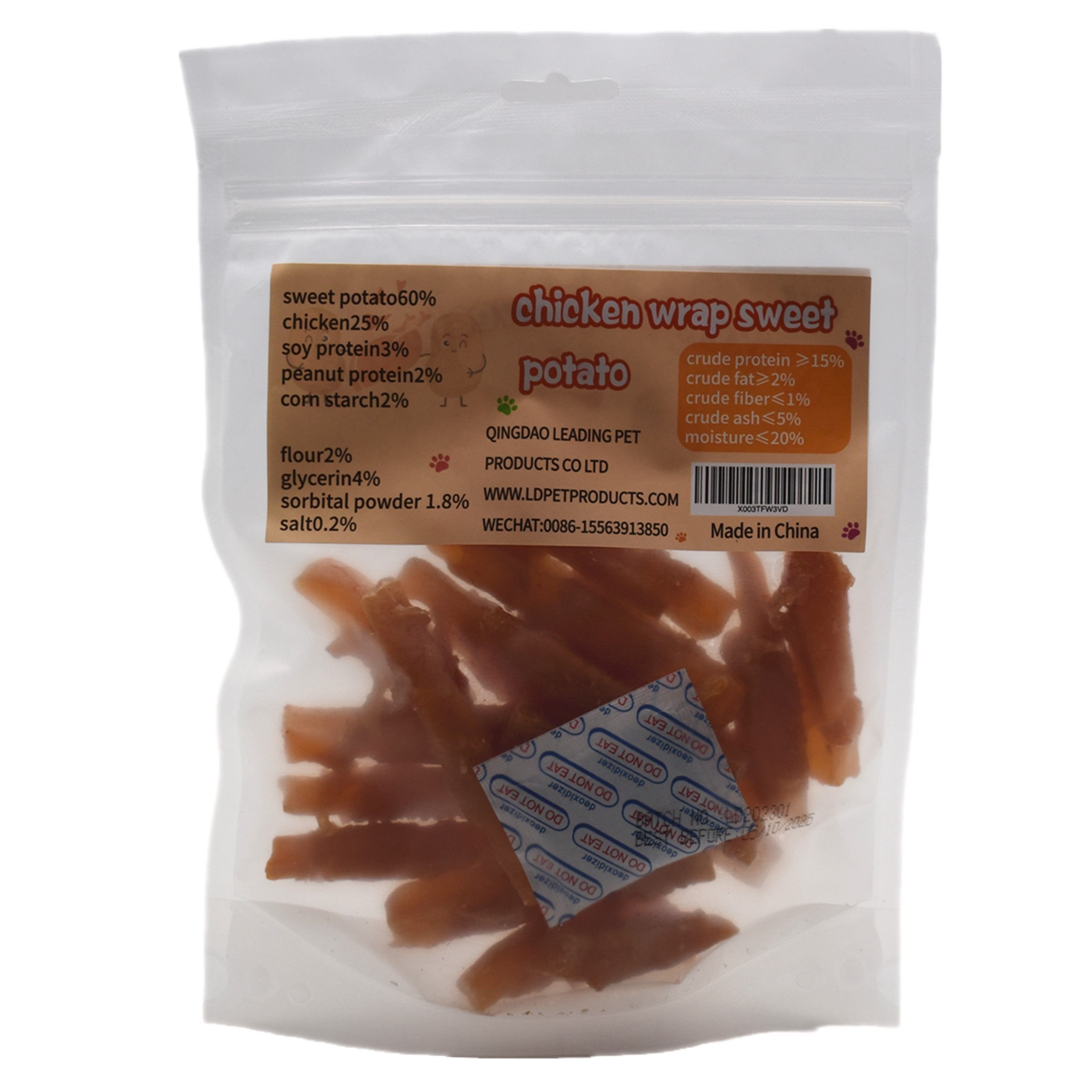 Pet snack is very popular among dogs. Dog treats can be used as a training prop for dogs, but also can enhance the bond between dogs and owners. Dog snacks is a very good food.Composition: sweet potato60% chicken25% soy protein3% peanut protein2% corn starch2% flour2% glycerin4% sorbital powder 1.8% salt0.2%.