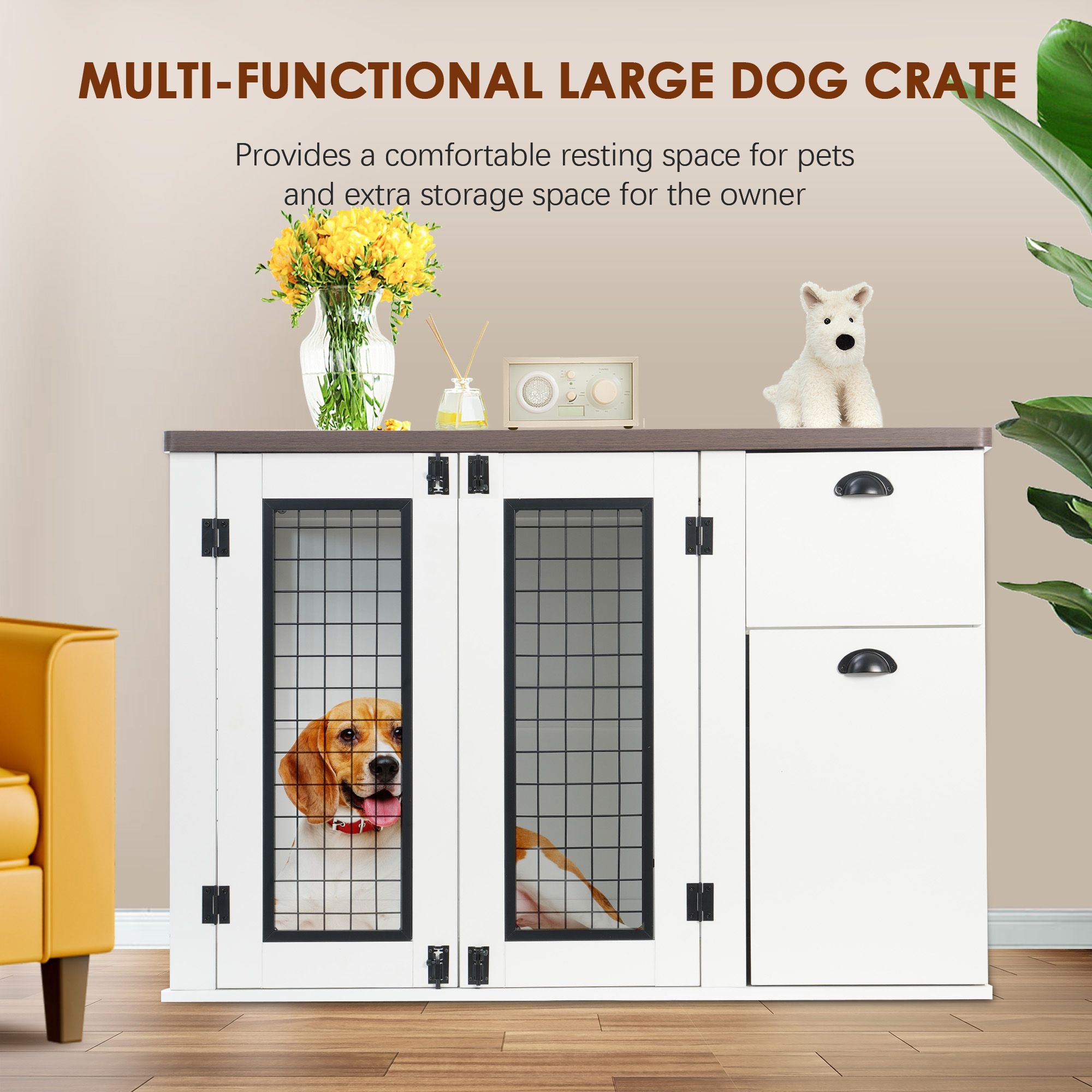 Elevate your home decor while giving your dog a cozy sanctuary with this Furniture-Style Dog Crate. This beautifully designed crate combines functionality and aesthetics, crafted from high-quality particle board in a sophisticated white and deep walnut finish. With dual doors for easy access, it offers your pet a secure, den-like retreat while seamlessly blending with your living space. Complete with convenient drawers and storage lockers for dog essentials, this versatile piece doubles as a stylish side cabinet, perfect for your living room or bedroom.