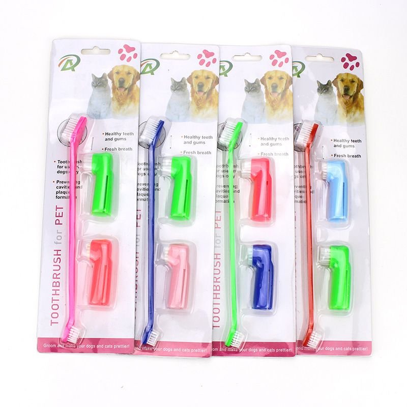 Two Headed Dog Toothbrush Set Canine Dental Hygiene Brush with 2 Finger Brushes Soft Bristles