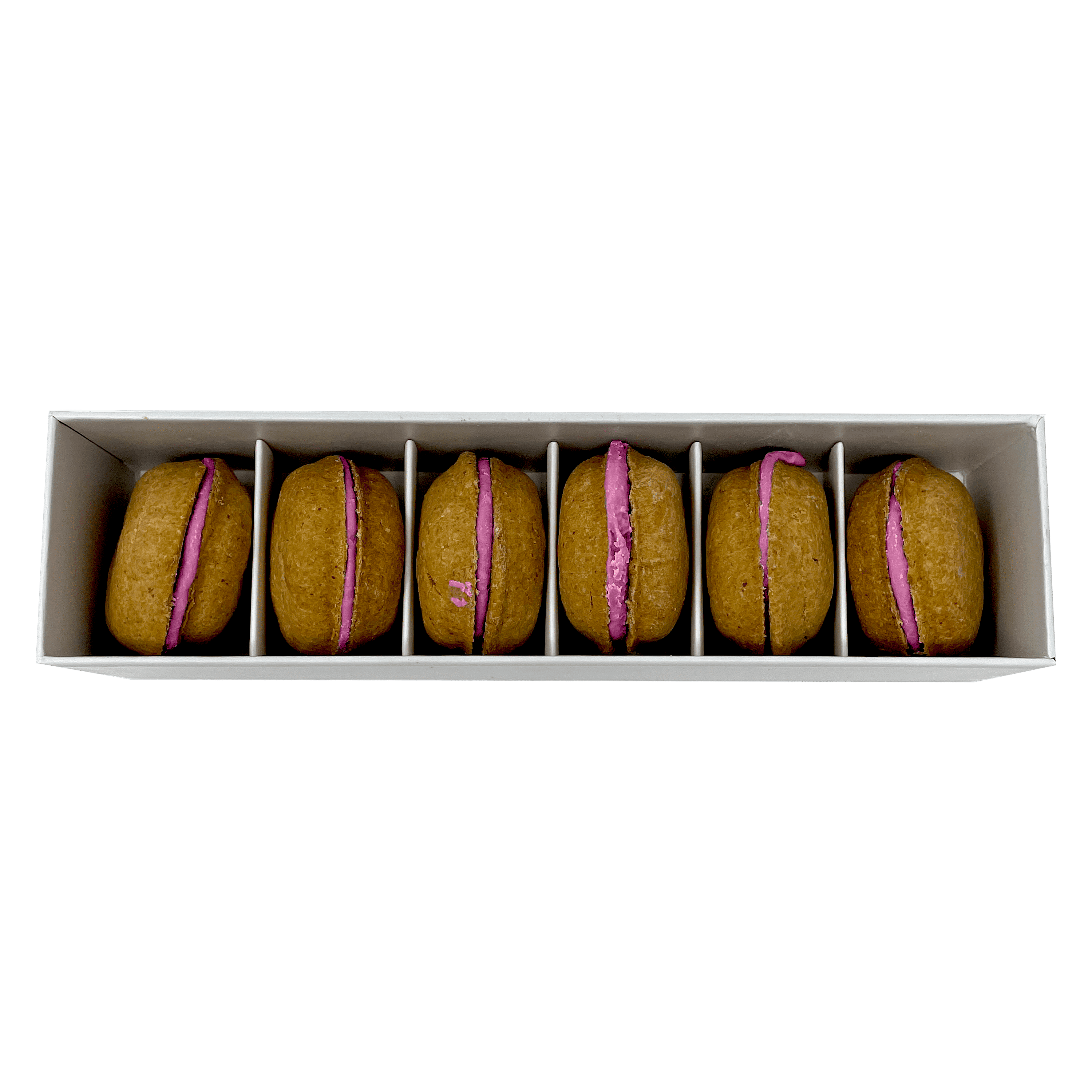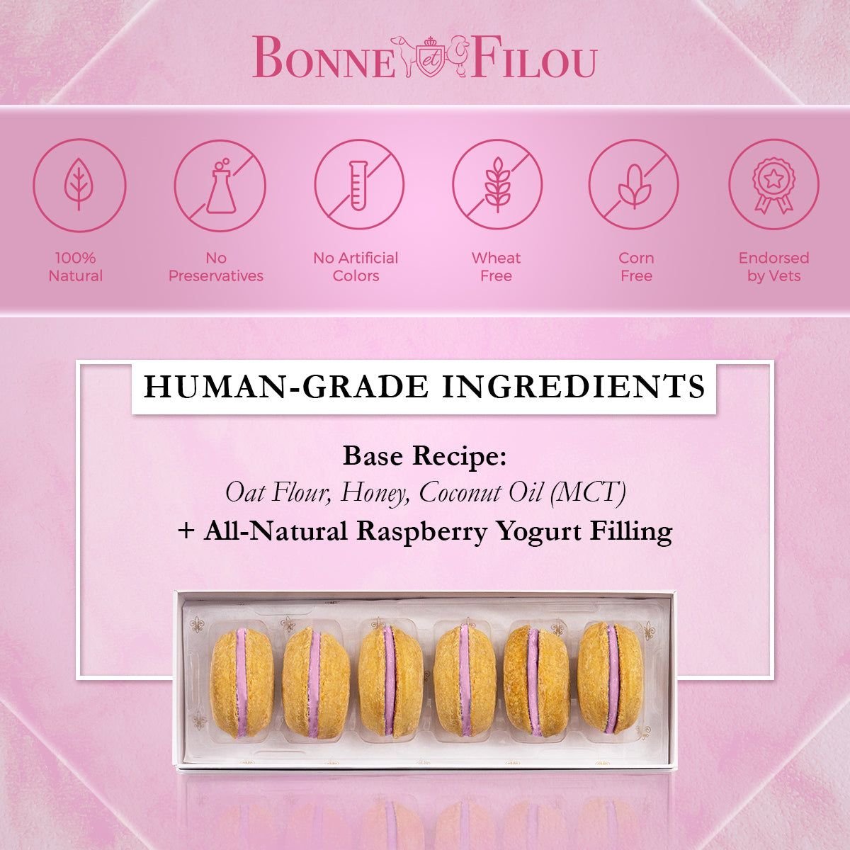 Dog Macarons - Count of 6 (Dog Treats | Dog Gifts)This box of our premium macaron treats features: - Box of 6 dog macarons- Handmade with premium human-grade ingredients in the USA- 100% natural; corn-free; wheat-free ingredients- No artificial coloring or preservatives- Hard treat designed for a long-lasting chew- Shelf life of 12+ months | No need for refrigerationBase Recipe Ingredients: Oat Flour; Honey; Coconut Oil; All-Natural Flavored Yogurt FillingFeeding Instructions:Our treats are hard; designed for a long-lasting chew. For elderly or small dogs; we recommend breaking the treat in smaller pieces (by twisting both sides).