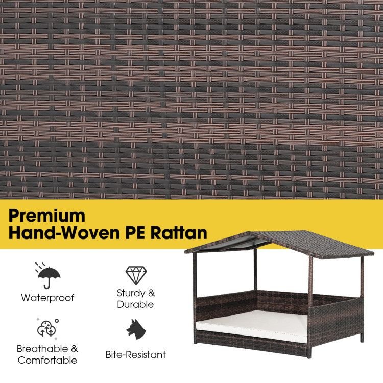 3.Weatherproof Design: The wicker dog house is crafted with premium hand-woven PE rattan that is characterized by water resistance and long-lasting durability, and the weatherproof roof provides a sheltered area for resisting harsh sun and light rain weather conditions, providing better protection for your lovely dog outdoors.