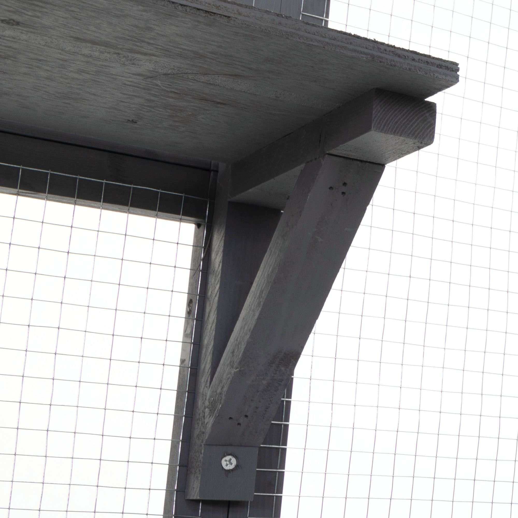 Specifications:Color: GrayMaterial: Fir+Galvanized Net+Polycarbonate PanelOverall Dimensions: 62.4"L x 32.4"W x 70.1"HWooden Frame Dimensions: 51.2"L x 20.9"W (x5); 20.9"L x 18.1"W (x6); 45.3"L x 15.4"W (x4); 30.7"L x 12"W (x4)Door (with Door Frame) Dimensions: 51.2"L x 20.9"WCat Perch Dimensions: 30.6"L x 9.3"W x 0.4"H (Left and Right); 20.9"L x 9.3"W x 0.4"H (Middle)Cat Condo Dimensions: 15.2"L x 9.3"W x 0.4"HTriangle Supporter Dimensions: 9.7"L x 9.7"W x 13.6"HPolycarbonate Panel Dimensions: 19.3"L x 30.7"W x 0.3"HNet Weight: 72.8 lbs