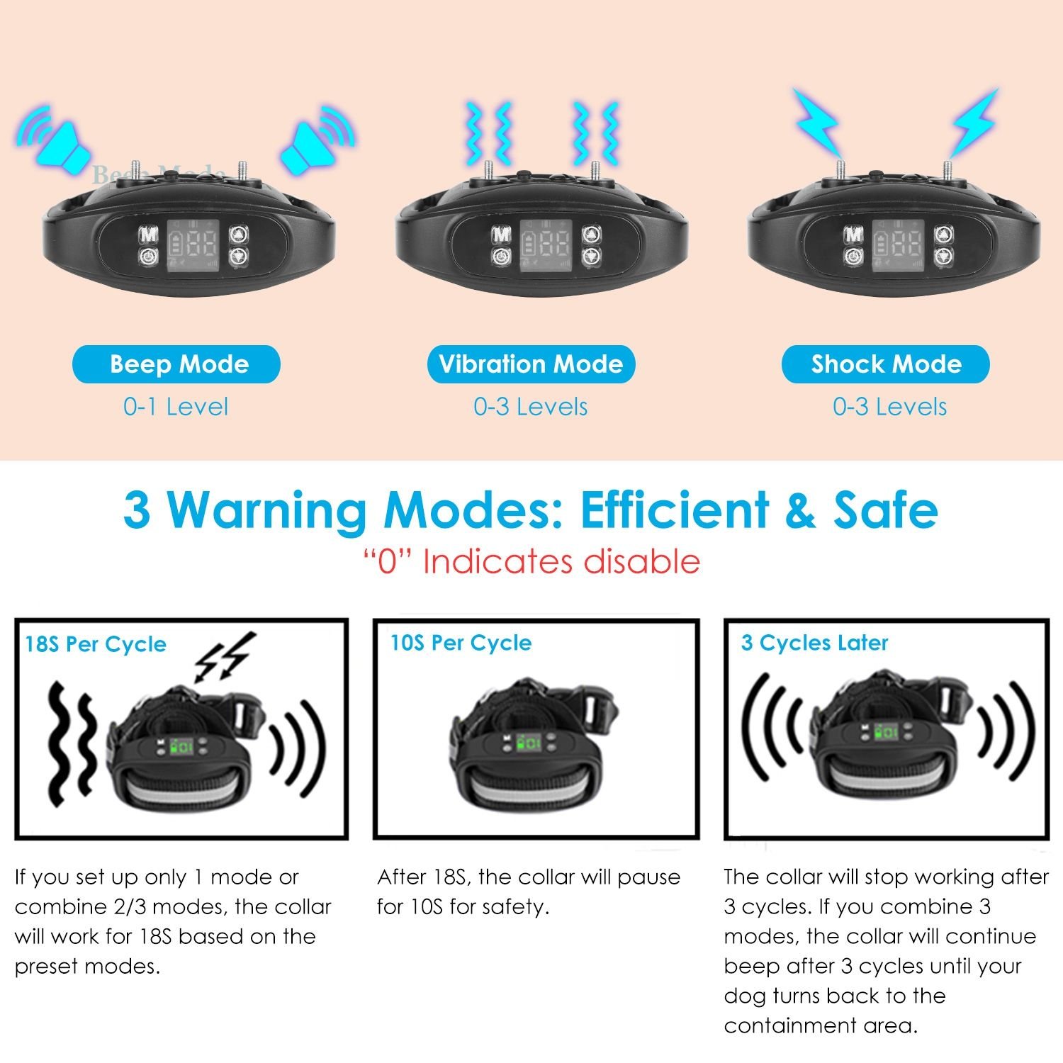 *3 Warning Modes*:Provide beep mode(1 level)/vibration mode(3 levels)/static shock mode(3 levels). You can set up only 1 mode or combine 2/3 modes based on your dog’s sensitivity and training. For safety,if your dog is getting closer to the boundary,the collar will work for 18S based on the preset modes,then pause for 10S and stop working after 3 cycles. If you combine 3 modes,the collar will beep,vibrate and shock simultaneously for 18S,then pause with only beep sounds for 10S,continue beep after 3 cycles until your dog turns back to the containment area.